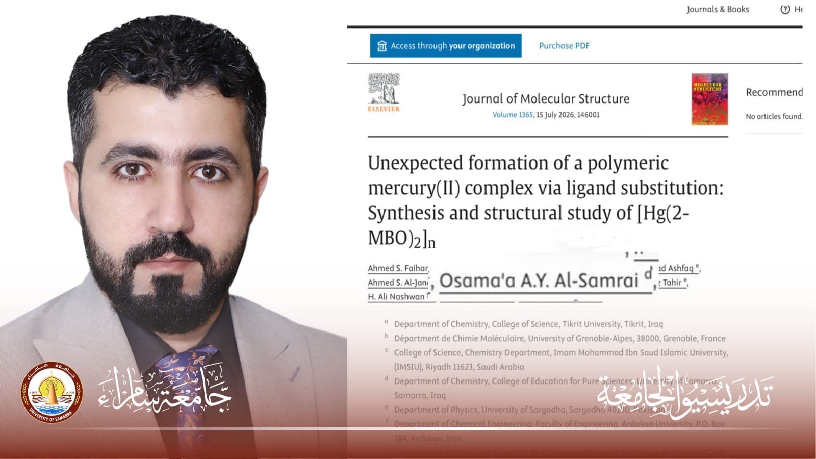 نشر الدكتور (أسامة أحمد ياسين)، التدريسي في كلية التربية للعلوم الصرفة بجامعة سامراء، بحثًا علميًا في مجلة Journal of Molecular Structure، التي تصدر عن دار النشر العالمية (Elsevier)، والمصنفة ضمن الربع الأول (Q1) في مستوعب سكوبس.