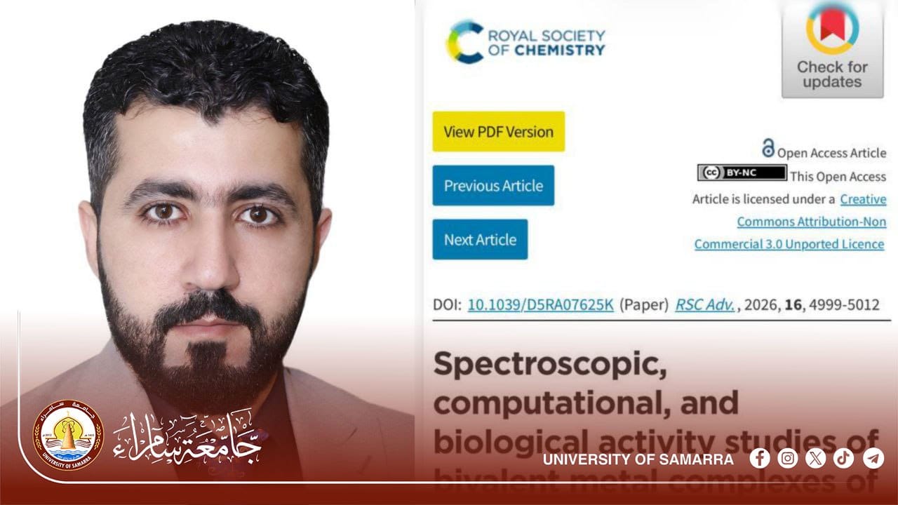 نشر الدكتور (أسامة أحمد ياسين)، التدريسي في قسم الكيمياء في كلية التربية للعلوم الصرفة بجامعة سامراء، بحثًا علميًا في مجلة RSC Advances، الصادرة عن دار النشر Royal Society of Chemistry التابعة للجمعية الملكية للكيمياء في المملكة المتحدة، والمصنّفة ضمن الربع الأول (Q1) في مستوعب سكوبس.