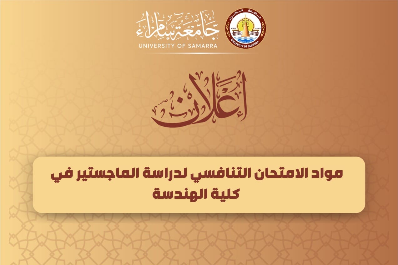 الطلبة المتقدمين لدراسة الماجستير في قسم هندسة العمارة، والهندسة المدنية، بكلية الهندسة في جامعة سامراء للعام الدراسي 2025-2026، نرفق لكم جدول المواد الدراسية ومصادرها المطلوبة لتأدية الامتحان