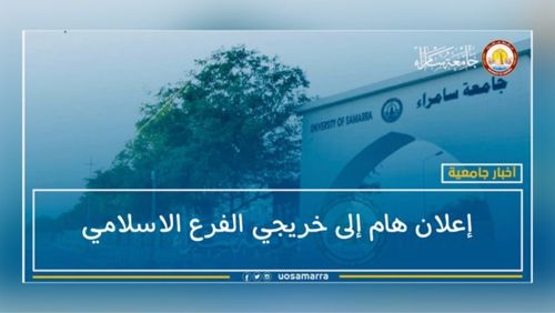 تعلن كلية العلوم الاسلامية في جامعة سامراء عن تمديد فترة التقديم ضمن (قناة القبول المباشر للفرع الاسلامي حصراً) للعام الدراسي (2021 – 2022) لخريجي الاعداديات الاسلامية التابعة لوزارة التربية والثانويات الاسلامية التابعة للوقفين (السني والشيعي) وللدورين (الاول- الثاني) الى غاية يوم السبت الموافق 20\11\2021.