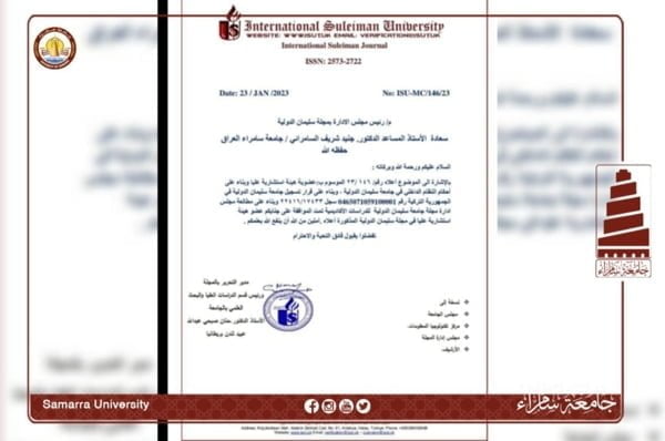 اختيرَ الأستاذ المساعد الدكتور جنيد شريف عبد -التدريسي- في كلية العلوم الإسلامية بجامعة سامراء عضوًا في الهيأة الاستشارية العليا لمجلة سليمان الدولية للدراسات الأكاديمية، التي تصدر في تركيا.