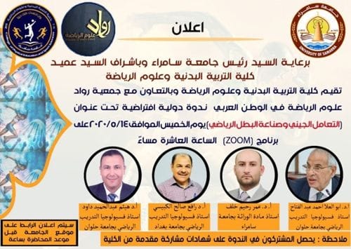 اعلان: الندوة الدولية الافتراضية الثانية بالتعاون مع جمعية رواد علوم الرياضة بعنوان (التعامل الجيني وصناعة البطل الرياضي )