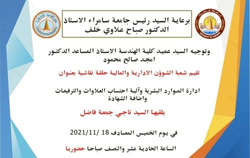 اعلان ندوة علمية بعنوان (إدارة الموارد البشرية والية احتساب العلاوات والترفيعات واضافة الشهادة)