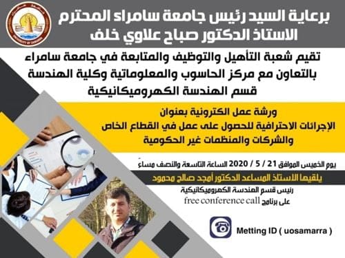 تقيم شعبة التأهيل والتوظيف والمتابعة في جامعة سامراء بالتعاون مع مركز الحاسوب والمعلوماتية وكلية الهندسة – قسم الهندسة الكهروميكانيكية ورشة عمل الكترونية بعنوان ( الاجرائات الاحترافية للحصول على عمل في القطاع الخاص والشركات والمنظمات غير الحكومية)