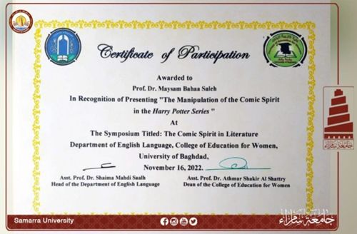 ألقت الأستاذ المساعد الدكتورة ميسم بهاء صالح –التدريسية- في كلية التربية بجامعة سامراء، بحثًا بعنوان ” معالجة الكوميديا في رواية هاري بوتر للكاتبة جي كي رولنغ “، وذلك في يوم الأربعاء الموافق 16 تشرين الثاني 2022، وضمن وقائع أعمال الندوة الثقافية الأدبية التي عقدتها كلية التربية للبنات بجامعة بغداد.
