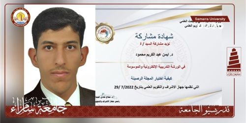 شارك الدكتور أيمن عبدالكريم محمود -التدريسي- في كليّة الآداب بجامعة سامراء، في وقائع أعمال الورشة التدريبيّة التي عقدها جهاز الإشراف والتقويم العلمي في وزارة التعليم العالي والبحث العلمي، التي حملت عنوان ” كيفيّة اختيار المجلّة الرّصينة “، وقُدّمت عبر منصة التّخاطر عن بعد ( كوكل ميت )، في التاسع والعشرين من شهر تموز في العام الجاري.