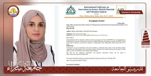 نشرت الآنسة وسن جعفر صادق -الموظفة- بكلية العلوم التطبيقية في جامعة، بحثًا علميًا بعنوان ” التقدير المتزامن للـ ترايفلوبيرازين و أيزوبروبامايد أيوديد بمطيافية الأشعة فوق البنفسجية “، وذلك في مجلّة ” International Conferennce on Innovation in Science “، المصنفة بالمستوى Q2 ضمن مستوعبات سكوباس.