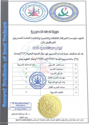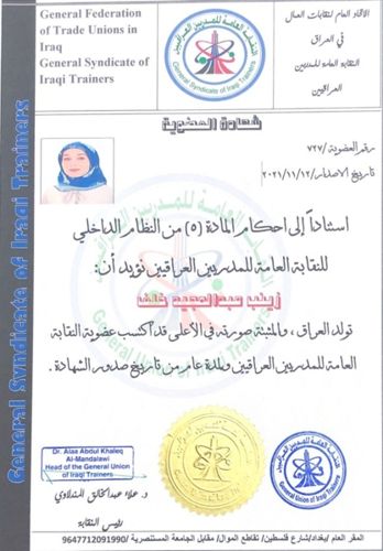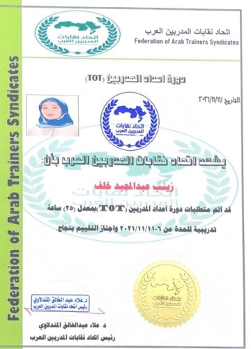حصلت المدرس الدكتورة زينب عبد المجيد خلف إحدى تدريسيات كلية الهندسة في جامعة سامراء على شهادة T.O.T( شهادة مدرب مدربين) من مؤسسة القلم للتدريب والتأهيل والتنمية  المستدامة.