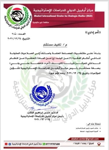كُلفت الأستاذ المساعد الدكتورة فاطمة علي ولي مستشارا لرئيس مركز أبابيل الدولي للدراسات الاستراتيجية لشؤون المؤتمرات.