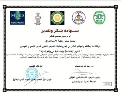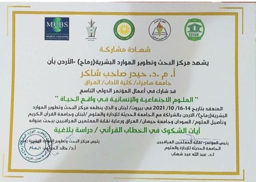 شارك الأستاذ المساعد الدكتور حيدر صاحب شاكر التدريسي بقسم اللغة العربية في كلية الآداب بأعمال المؤتمر العلمي الدولي التاسع الموسوم ((العلوم الاجتماعية والإنسانية في واقع الحياة)) والمنعقد بتاريخ 14-16/10/2021 في بيروت- لبنان والذي نظَّمه مركز البحث وتطوير الموارد البشرية (رماح)/الأردن بالشراكة مع الجامعة الحديثة للإدارة والعلوم /لبنان وجامعة القرآن الكريم وتأصيل العلوم/ السودان، وجامعة جيهان/العراق ورعاية نقابة المعلمين العراقيين، وقد قدَّم الدكتور حيدر صاحب ببحثين مشتركين مع المدرس الدكتورة شيماء عبد الرحيم صالح/وزارة التربية.