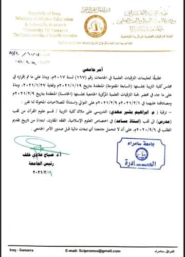 ترقية التدريسي إبراهيم بشير مهدي