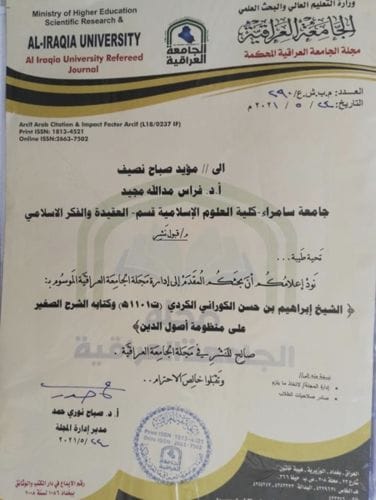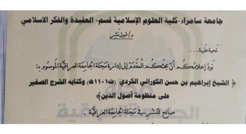 نشر التدريسي في كلية العلوم الاسلامية بجامعة سامراء الاستاذ الدكتور فراس مدالله مجيد بحثاً مشتركاً بعنوان ( الشيخ ابراهيم بن حسن الكوراني الكردي (ت1101ه) وكتابه الشرح الصغير على منظومة اصول الدين) مع الباحث مؤيد صباح نصيف, حيث تناول البحث مسائل مادة العقيدة الاسلامية الخاصة بالإلهيات من حيث الاسماء والافعال والصفات كذلك سلط البحث على المسائل الخلافية بين الفرق الاسلامية مثل (اهل السنة والجماعة والمعتزلة) فطرحت فيه اراء الفرق والاختلاف في بعض المسائل الذي ذكرت في البحث وكذلك المسائل العقائدية الخاصة بمادة العقيدة.