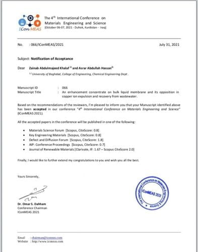عن بحثها الموسوم ( An enhancement concentrate on bulk liquid membrane and its opposition in