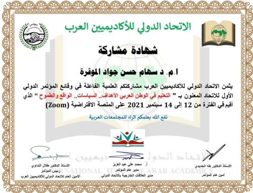 شاركت الأستاذ المساعد الدكتورة (سهام حسن) التدريسية من كلية الآداب ، في المؤتمر الدولي الأول الذي أقامه الإتحاد الدولي للأكاديميين العرب والمعنون بـ ( التعليم في الوطن العربي الأهداف..السياسات..الواقع والطموح ) ببحثها الموسوم بـ ( اللغة الفصحى ودورها في عالمية النص الأدبي _ الرواية الجزائرية أنموذجًا ) والذي أقيم في المدة من ١٢ إلى ١٤ سبتمبر ٢٠٢١ على المنصة الافتراضية( Zoom )