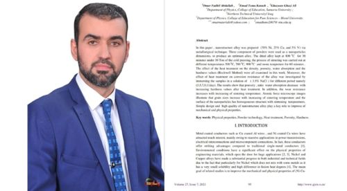 وجاء البحث الذي يقوم على فكرة تحضير سبيكة نيكل نحاس فناديوم بنسب متفاوتة بطريقة تكنولوجيا المساحيق وإبعاد نانوية. والذي تم إجراء معاملة حرارية لدرجات مختلفة ولزمن ثابت من خلاله؛ وقد لوحظ التأثير الفعال للمعاملة الحرارية على خواص السبيكة الفيزيائية كالكثافة والمسامية والامتصاصية وكذلك الصلادة (بطريقة روكويل).