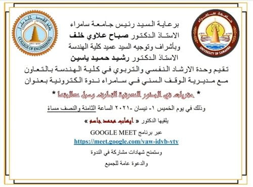 ستقيم شعبة الإرشاد النفسي والتوجيه التربوي في رئاسة الجامعة وبتنفيذ مباشر من وحدة الارشاد النفسي والتوجيه التربوي في كلية الهندسة وبالتعاون مع مديرية الوقف السني في سامراء ندوة تحاورية مساء هذا اليوم الخميس ١ / ٤ / ٢٠٢٠ بعنوان (حفريات في الجذور المعرفية للتطرف وسبل معالجتها).