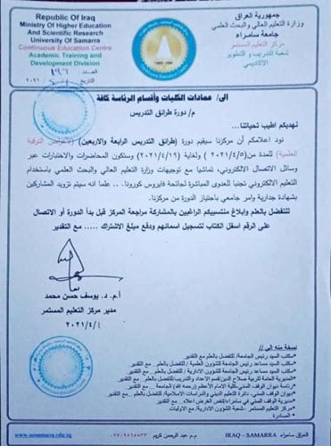جامعة سامراء – مركز التعليم المستمر بجامعة سامراء سيقيم دورة طرائق التدريس الرابعة والأربعين