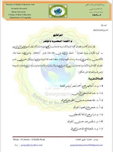 أُختير الأستاذ الدكتور طه مصحب حسين التدريسي في جامعة سامراء كلية التربية -قسم الجغرافية- عضوا في اللجنة التحضيرية للمؤتمر العلمي الدولي الذي تنظمه منصة ايفاد للاكاديميين وبالتعاون مع قسم الدراسات والتراث بمنظمة الصداقة الدولية للفترة من 20_22 / 2 /2022.
