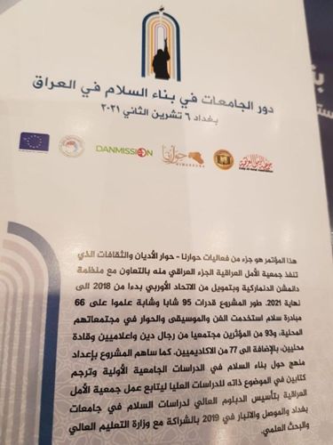 تناولت فعاليات المؤتمر دور الجامعات في بناء السلام والسلم المجتمعي ضمن برنامج تبنته جمعية الأمل العراقية وهو برنامج يأخذ جانب حوار الأديان والثقافات والتعريف بمبادئ وخصائص دراسات السلام في المجتمع العراقي.
