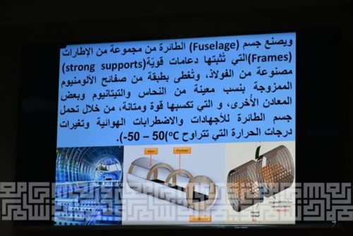 حيث وضح المحاضر ان الهندسة  مبينة على المفاهيم الفيزياوية بنسبة ٩٩% ومدى الاستفادة منها في التطوير  والتصميم وقدم المحاضر شرحا وافيا عن اجزاء الطائرة وانواعها .