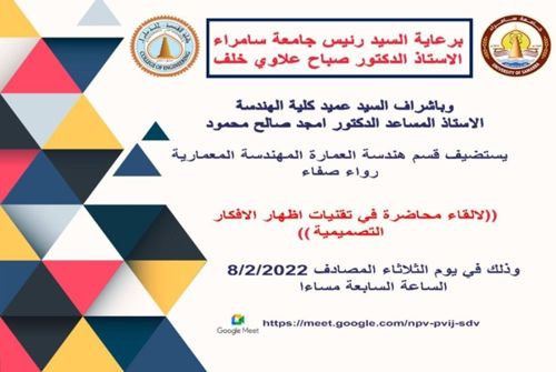 برعاية الأستاذ الدكتور صباح علاوي السامرائي رئيس جامعة سامراء وبتوجيه وإشراف الأستاذ المساعد الدكتور أمجد صالح محمود عميد كلية الهندسة، سيقيم قسم هندسة العمارة في كلية الهندسة محاضرة بعنوان (تقنيات اظهار الافكار التصميمية) يستضيف فيها المهندسة المعمارية رواء صفاء يوم الثلاثاء الموافق (٢٠٢٢/٢/٨ ) إلكترونياً في الساعة ٧:٠٠ مساءا عبر تطبيق الgoogle meet .