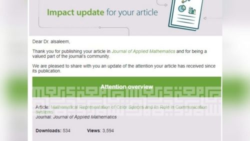؛ وذلك لوصول عدد مشاهدات البحث في موقع المجلة الى 3594 وعدد تحميل هذا البحث الى 534 من قبل الجامعات الكندية ، وقد عدت المجلة هذا البحث إنجازا مميزا وفريدا من نوعه .