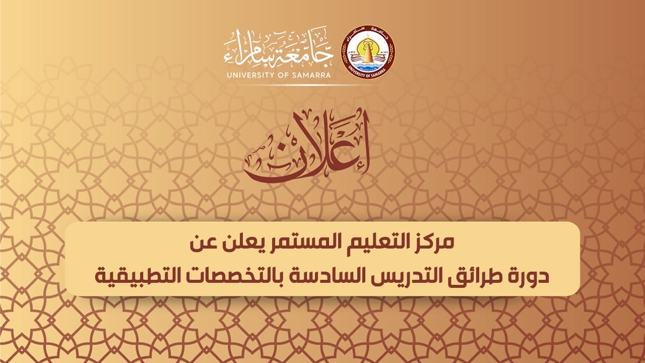 يعلن مركز التعليم المستمر في رئاسة جامعة سامراء عن فتح باب التقديم لدورة طرائق التدريس المحدثة السادسة بالتخصصات (التطبيقية)، تمتد لستة أسابيع، وفق المنهاج المحدث.