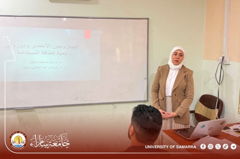 بيّنت كلية التربية للعلوم الصرفة بجامعة سامراء “الهيدروجين الأخضر ودوره في تنمية الطاقة المستدامة” بندوة علمية قدمتها المدرس المساعد (سارة ساجد توفيق) التدريسية في قسم الفيزياء بالكلية.