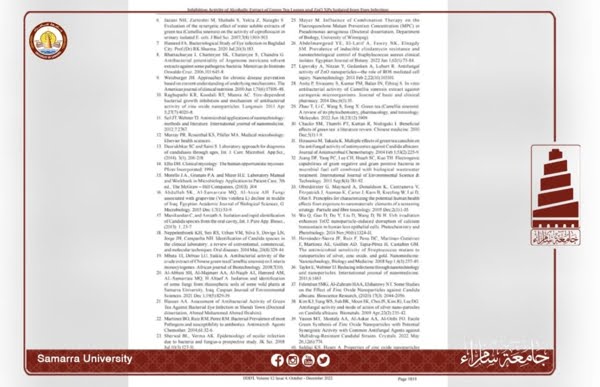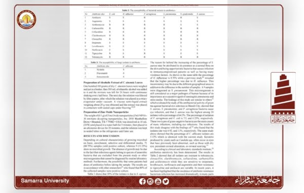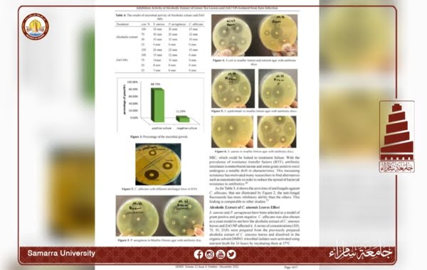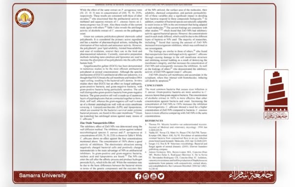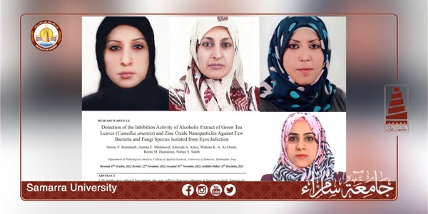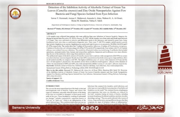 قدمت تدريسيات في كلية العلوم التطبيقية بجامعة سامراء، بحثًا علميًا بعنوان ” الكشف عن الفعالية التثبيطية للمستخلص الكحولي لأوراق الشاي الأخضر Camellia sinensis وجزيئات أكسيد الزنك النانوية ضد عدد قليل من أنواع البكتيريا والفطريات المعزولة من إصابات العين “، والذي نُشِر في مجلة International Journal of Drug Delivery Technology، المصنفة ضمن مستوعبات سكوباس العالمية بمستوى Q3، في عددها الصادر بشهر كانون الاول 2022.