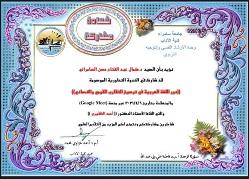 جامعة سامراء – شعبة الإرشاد النفسي والتوجيه التربوي تعلن شهادات المشاركة في الندوة العلمية الإلكترونية حول ترسيخ التقارب القومي ودور اللغة العربية في ذلك.