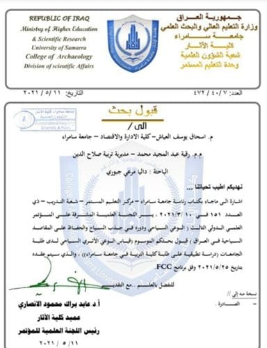 شارك السيد مقرر قسم الاقتصاد م. اسحق يوسف العياش ببحث بعنوان “قياس الوعي الأثري السياحي لدى طلبة الجامعات ، دراسة تطبيقية على طلبة كلية التربية في جامعة سامراء