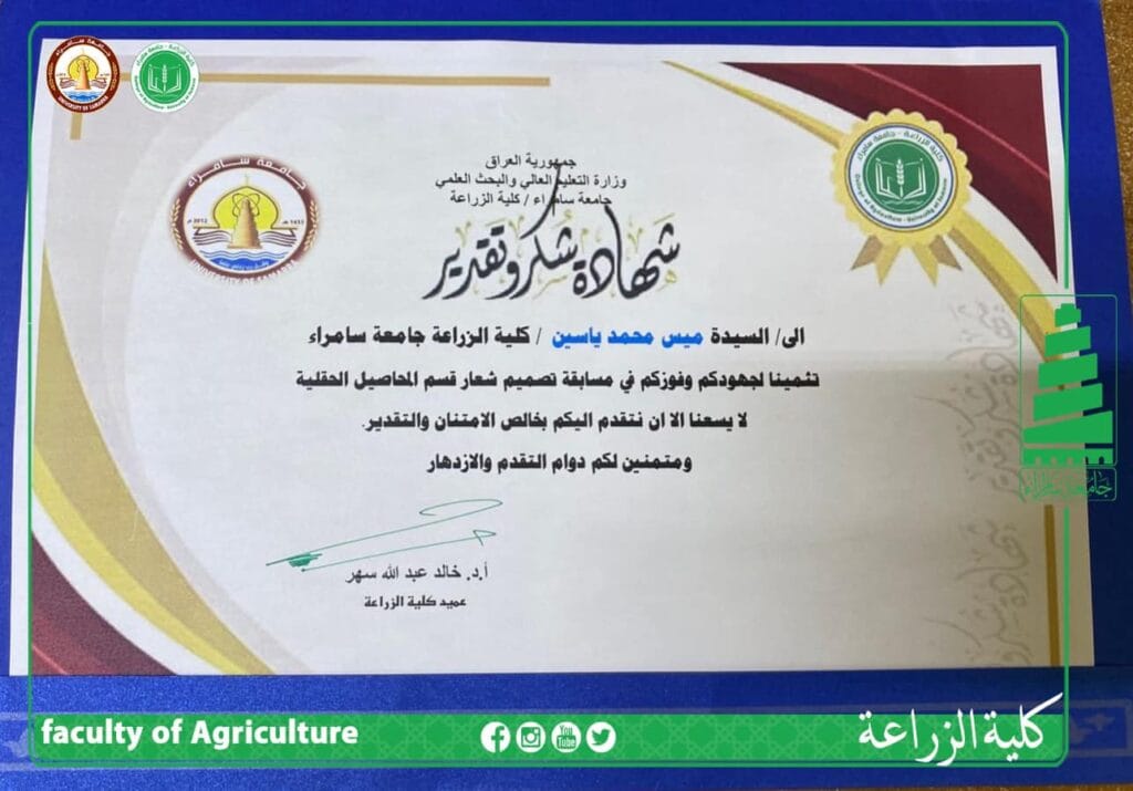 كرم عميد كلية الزراعة جامعة سامراء الاستاذ الدكتور خالد عبدالله سهر ، “السيدة ميس محمد ياسين ” لفوزها ولتميزها في تصميم شعار قسم المحاصيل الحقلية .‏