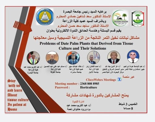 عميد كلية الزراعة الاستاذ الدكتور خالد عبدالله السهر يلقي محاضرة في ندوة علمية دولية الموسومة ( مشاكل نباتات نخيل التمر الناتجة من الزراعة النسيجية وسبل معالجتها ) التي اقاتها عمادة كلية الزراعة في جامعة البصرة وشاركت في هذه الندوة عدة دول عربية أبرزها مصر والمغرب العربي و الاردن وذلك في يوم الخميس ٦ / ٢ / ٢٠٢٢