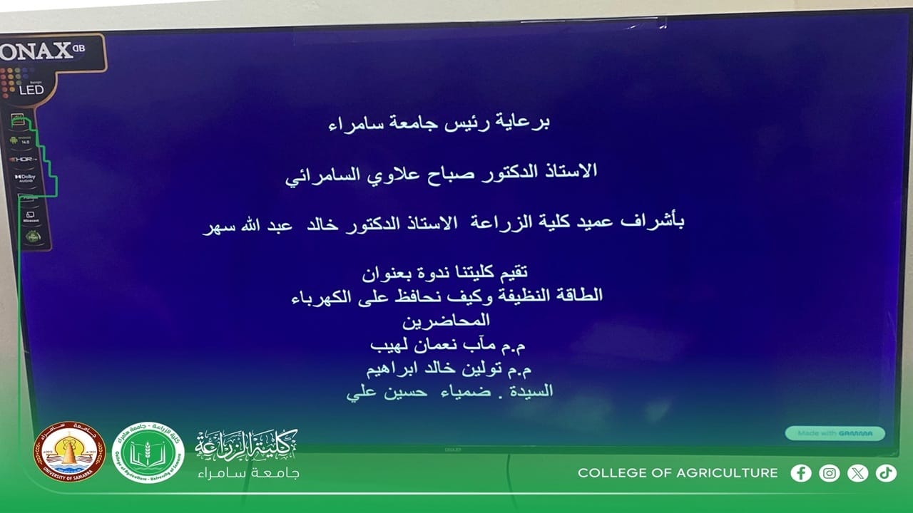 أقامت كلية الزراعة في جامعة سامراء ندوة علمية توعوية بعنوان (الطاقة النظيفة وكيف نحافظ على الكهرباء)، وذلك ضمن نشاطاتها العلمية الهادفة إلى نشر الوعي البيئي وترسيخ ثقافة الاستخدام الأمثل للطاقة.