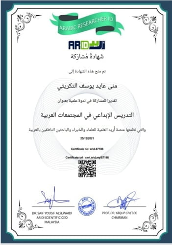 شارك رئيس قسم المحاصيل الحقلية في كلية الزراعة الدكتورة منى عايد يوسف في ندوة دولية على منصة اريد للباحثين العرب بعنوان التدريس للابداع الفرص والتحديات تم فيها مناقشة مهارات التفكير الابداعي مدخل لتطوير تعليم العلوم الشرعية والادبية اضافة الى مناقشة استراتيجيات التدريس الابداعي في التعليم الواقع واساليب التقويم واثرها في تنمية الابداع .