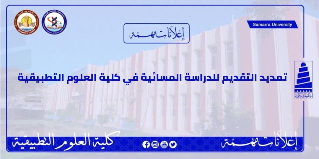 أعلنت كلية العلوم التطبيقية بجامعة سامراء وبناءً على قرار وزارة التعليم العالي والبحث العلمي وحصول موافقة معالي الوزير تمديد السقف الزمني للتقديم على الدراسة المسائية لغاية نهاية الدوام الرسمي ليوم الخميس الموافق 27 من الشهر الحالي و حسب الضوابط والتعليمات