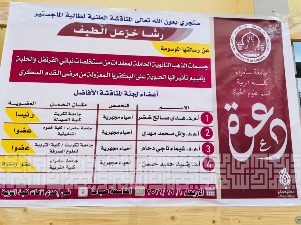 شارك الاستاذ المساعد الدكتور (وائل محمد مهدي) المعاون العميد للشؤون العلمية والدراسات العليا في كلية العلوم التطبيقية والتدريسي في قسم التقانات الاحيائية في مناقشة رسالة الماجستير، الموسومة بـ ” جسيمات الذهب النانوية الحاملة لمعقدات من مستخلصات نباتي القرنفل والحلبة وتقييم تأثيراتها الحيوية على البكتريا المعزولة من مرضى القدم السكري “، والتي قدمتها الطالبة في القسم ( رشا خزعل الطيف ).