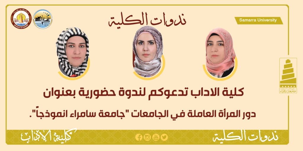 يقيم قسم التاريخ في كلية الآداب بالتعاون مع وحدة تمكين المراة في الجامعة ندوة علمية حضورية بعنوان ( دور المراة العاملة في الجامعات ( جامعة سامراء إنموذجا ) تلقيها الأستاذ الدكتورة ( غزوة شهاب احمد ) التدريسية في كلية التربية والدكتورة(بيداء شهاب احمد )وتديرها المدرس الدكتورة ( نور عماد فاضل ) مقررة قسم التاريخ بكلية الآداب وذلك يوم الاحد الموافق 27/ تشرين الثاني / 2022 في احدى قاعات كلية الاداب ، الساعة 11:00 صباحاً.