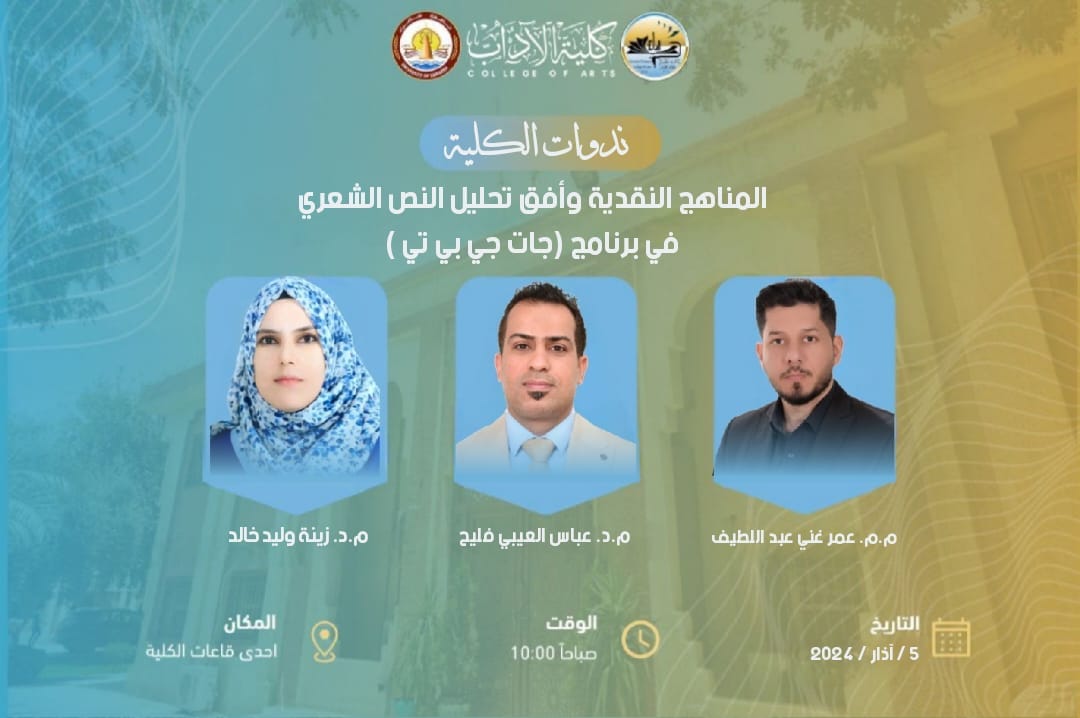 ينظم قسم اللغة العربية في كلية الآداب بـ جامعة سامراء ندوة علمية بعنوان “المناهج النقدية وأفق تحليل النص الشعري في برنامج ChatGPT”، وذلك يوم الخميس الموافق 5 آذار، ضمن الأنشطة العلمية التي يسعى القسم إلى تنظيمها لمواكبة التطورات الرقمية وتوظيف التقنيات الحديثة في الدراسات الأدبية والنقدية.