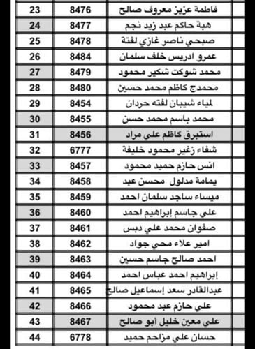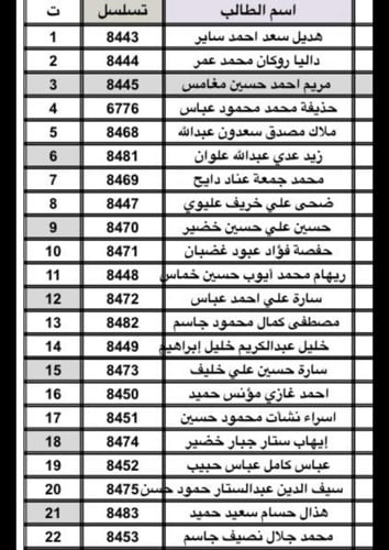 على الطلبة المدونة أسمائهم في الجدول أدناه من الذين تم قبولهم في القوائم الاخيرة الخاصة بالادوار (الاول و الثاني و الثالث) و على ((الدراسة الصباحية)) من الذين لم يقدموا مسبقاً ، مراجعة شعبة التسجيل لغرض المباشرة في أقسامهم واعتباراً من يوم غد الاربعاء 3-1-2021 و لغاية يوم الاثنين من الاسبوع القادم .