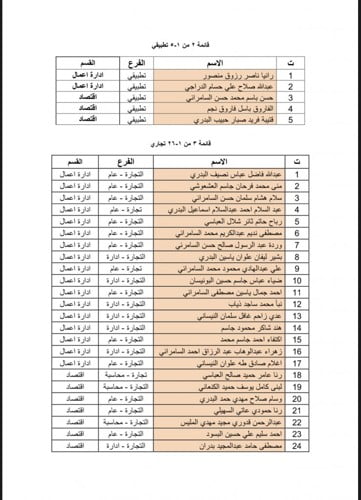 تعلن عمادة كلية الادارة والاقتصاد عن قوائم القبول الاولي لطلبة الدراسة المسائية الوجبة الثانية من 1-4 الذين اكملوا ملفاتهم وتسجيلهم وتدعوهم الى مراجعة الكلية -الاقسام العلمية إعتباراً من يوم الاحد 24-1- 2021 .