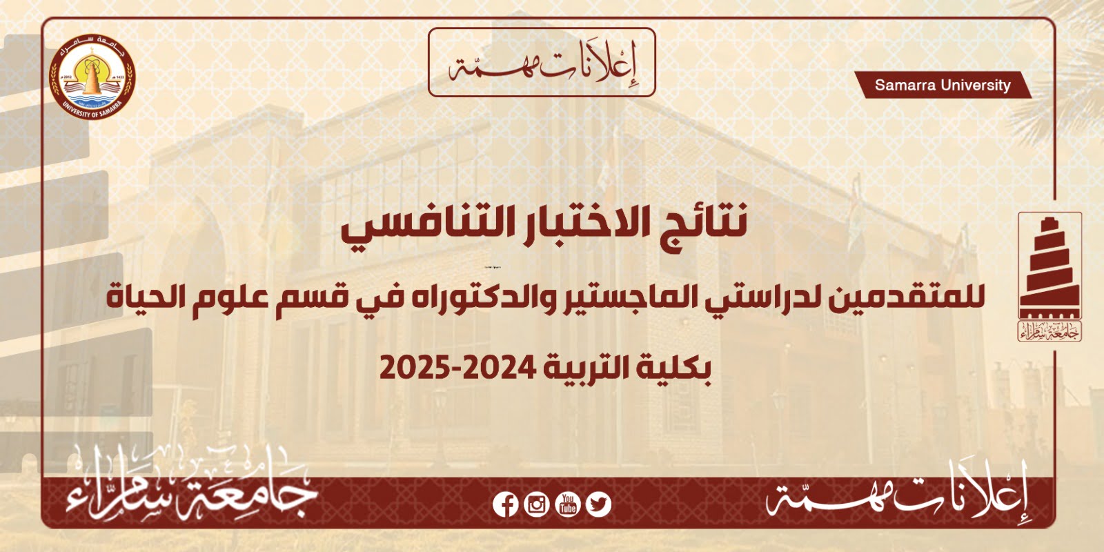 نتائج الاختبار التنافسي للطلبة المتقدمين للدراسات العليا في قسم علوم الحياة بكلية التربية بجامعة سامراء للعام الدراسي 2024-2025