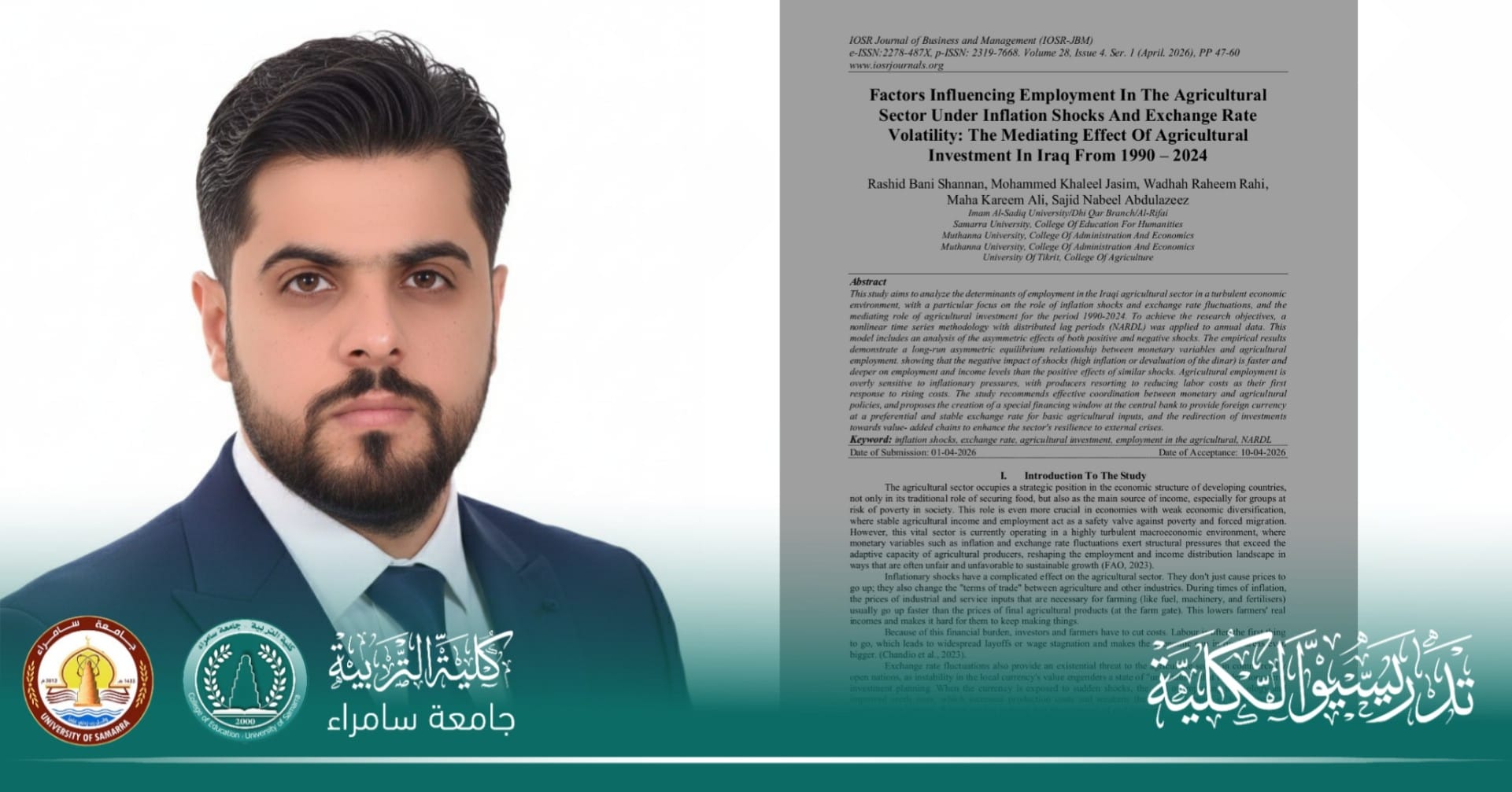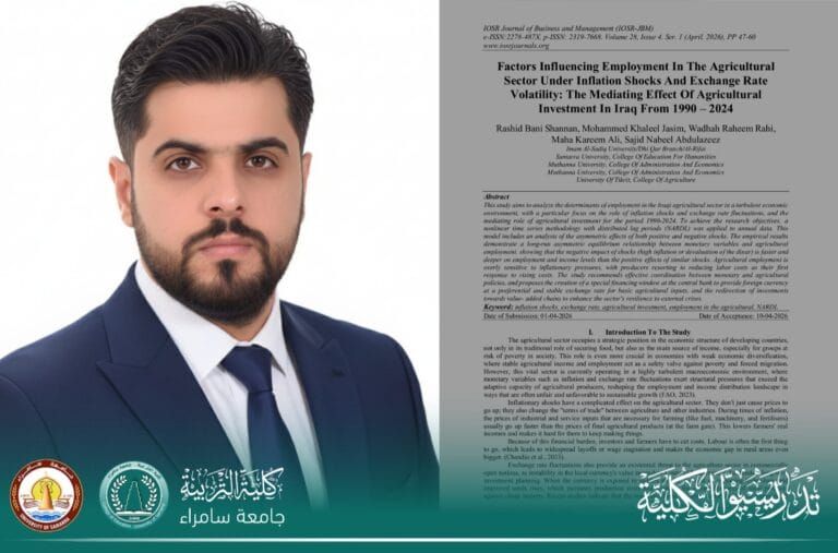 إذ جاء نشر البحث في مجلة Journal of Business and Management الصادرة عن دار النشر International Organization of Scientific Research (IOSR)، وبحث محددات التشغيل في القطاع الزراعي العراقي ضمن بيئة اقتصادية متقلبة.
