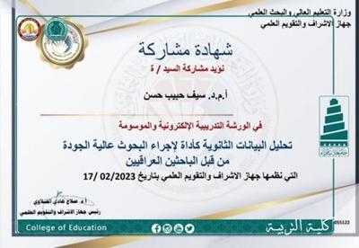 شاركَ الأستاذ المساعد الدكتور « سيف حبيب حسن » رئيس قسم اللغة الإنگليزية في كلية التربية – بجامعة سامراء بالورشة التدريبية الإلكترونية الموسومة ( تحليل البيانات الثانوية كأداة لإجراء البحوث عالية الجودة من قبل الباحثين العراقيين ) التي نظمها جهاز الإشراف والتقويم العلمي بوزارة التعليم العالي والبحث العلمي بتاريخ 2023/2/17.