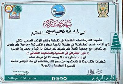 شاركَ الأستاذ الدكتور « طه مصحب حسين الخزرجي » التدريسي بقسم الجغرافية في كلية التربية – بجامعة سامراء ببحثه الموسوم ( ستراتيجية التنمية وتخطيط الخدمات الترفيهية وآفاقها المستقبلية مدينة بلد انموذجًا ) ، في وقائع المؤتمر العلمي الثاني الذي تستضيفه جامعة كركوك بعنوان ( دور الجغرافي في التنمية والتخطيط المكاني ) بتاريخ 15- 16 آذار 2023 .