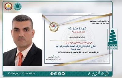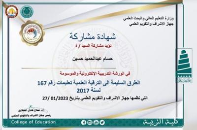شاركَ الأستاذ المساعد « حسام عبدالحميد حسين » رئيس قسم الفيزياء في كلية التربية – بجامعة سامراء بالورشة التدريبية الإلكترونية الموسومة ( الطرق السليمة الى الترقية العلمية تعليمات رقم 167 لسنة 2017 ) التي نظمها جهاز الإشراف والتقويم العلمي بوزارة التعليم العالي والبحث العلمي بتاريخ 2023/1/27.
