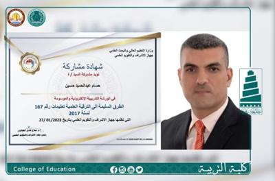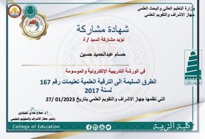 شاركَ الأستاذ المساعد « حسام عبدالحميد حسين » رئيس قسم الفيزياء في كلية التربية – بجامعة سامراء بالورشة التدريبية الإلكترونية الموسومة ( الطرق السليمة الى الترقية العلمية تعليمات رقم 167 لسنة 2017 ) التي نظمها جهاز الإشراف والتقويم العلمي بوزارة التعليم العالي والبحث العلمي بتاريخ 2023/1/27.