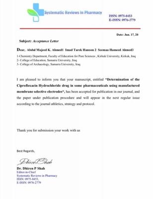 نشر التدريسي في جامعة سامراء _ كلية التربية _ قسم الكيمياء ( أ.م.د. عماد طارق حنون ) بحثاً بعنوان تقدير عقار السايبروفلوكساسين في المستحضرات الصيدلانية بواسطة بناء اقطاب انتقائية غشائية سائلة في مجلة تخص العلوم الصيدلانية وهي مجلة عالمية رصينة ذات معامل تأثير عالي ضمن مستوعبات سكوبس ، هذا البحث قام بتقدير الادوية بطرق تصنيعية تمثل بصناعة قطب من الاغشية وهو يظاهي الاقطاب الصناعية المصنعة الامريكية والبريطانية وهذا القطب يصنع لكل دواء موجود من مادته الفعالة