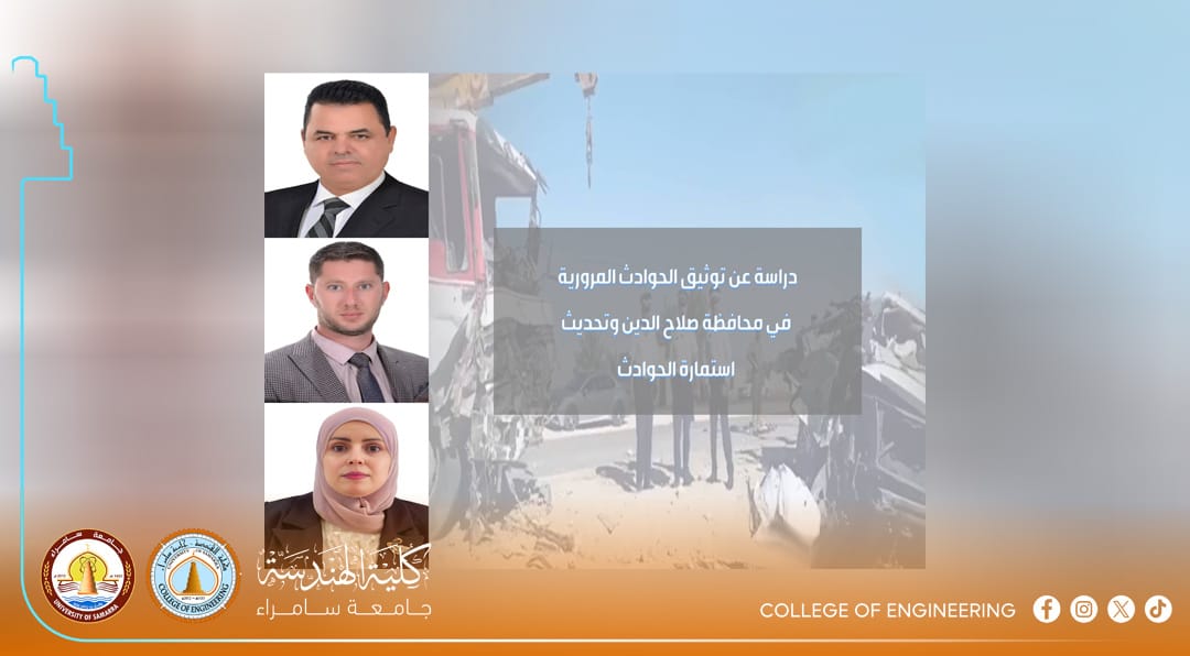 قدّم فريق بحثي متخصص في قسم الهندسة المدنية بكلية الهندسة في جامعة سامراء دراسة مهمة تهدف إلى تحسين توثيق الحوادث المرورية وتحديث استمارة التسجيل المعتمدة في محافظة صلاح الدين، ضم الفريق الأستاذ المساعد الدكتور رائد عبد الله والمدرّس المساعد أحمد هادي محمود والمدرسة المساعدة ساره عدنان سعيد.