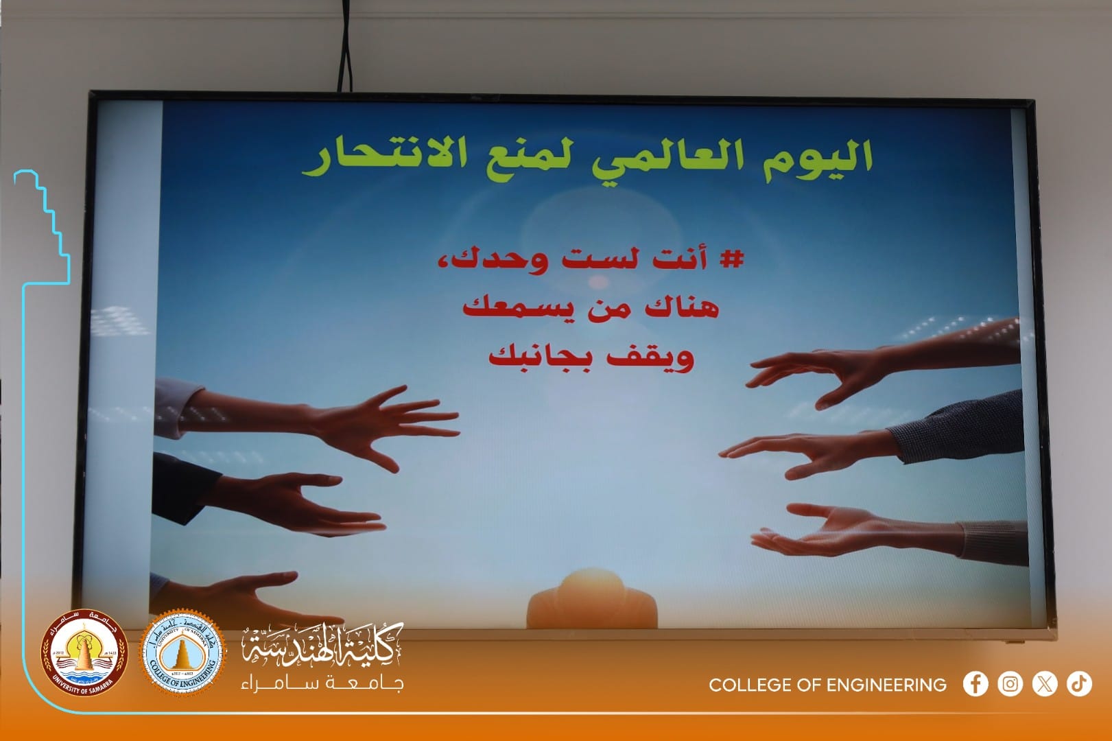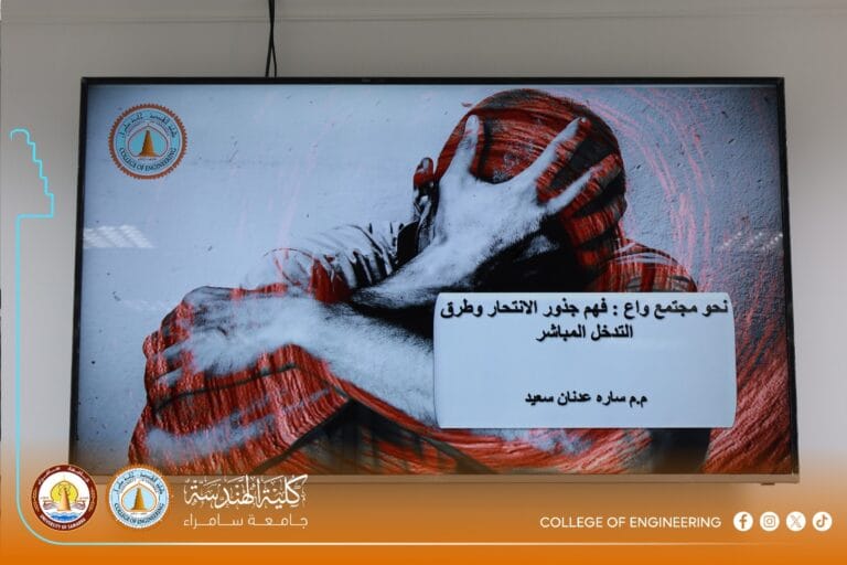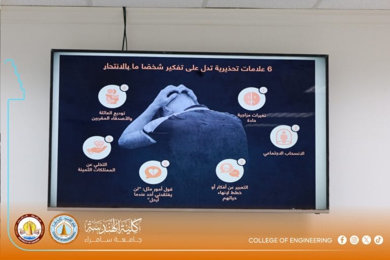 نظمت وحدة الإرشاد النفسي الجامعي في كلية الهندسة بجامعة سامراء ورشة عمل توعوية تحت عنوان “نشر الوعي المجتمعي بمخاطر الانتحار وسبل الوقاية منه”، قدمتها المدرسة المساعدة ساره عدنان سعيد، التدريسية في قسم الهندسة المدنية.